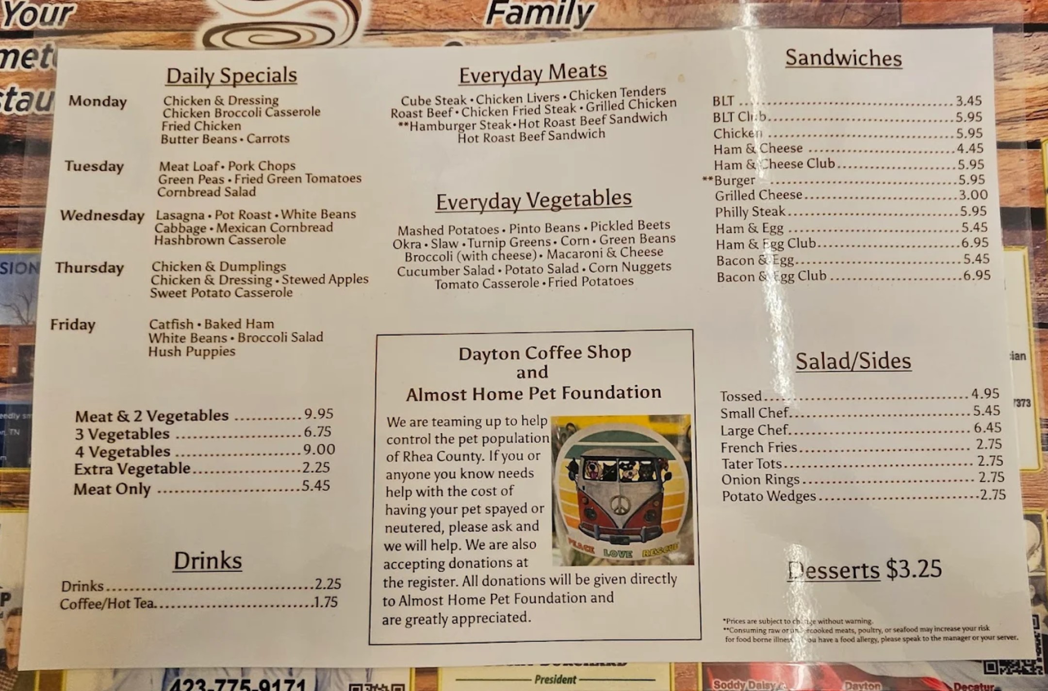 Dayton Coffee Shop, located at 280 2nd Avenue in the heart of Downtown Dayton—one block from the Historic Courthouse and surrounded by lots of small shops—stands as a slice of Southern culture and hospitality where tradition thrives. This IS a Coffee Shop in the old usage, where folks stop in to have a cup of coffee and shoot the breeze, though it's also a full-blown restaurant that's been around longer than ALL of the chain and independent coffee shops redefining modern expectations. Before it was Dayton Coffee Shop it was The Daytona or some similar name, way back. The establishment remains successful as evidenced by packed houses from lunchtime crowds, and they don't appear to be going anywhere anytime soon. For those expecting cookie-cutter experiences, think "Local Diner" instead. Good ole country restaurant. This wonderful hidden gem delivers southern comfort food at its best—the kind that makes customers feel like they've eaten at mama's house. Home cooked food. Fresh food. The best Mexican cornbread and chicken fried chicken anywhere, period. Pot roast, pork chops, and chicken livers to die for. Great chicken fingers, hamburger steak, even their hamburger and fries prove good. Delicious cornbread partners with the best sweet tea in Rhea County by long shot. Definitely try the blackberry cobbler with ice cream!